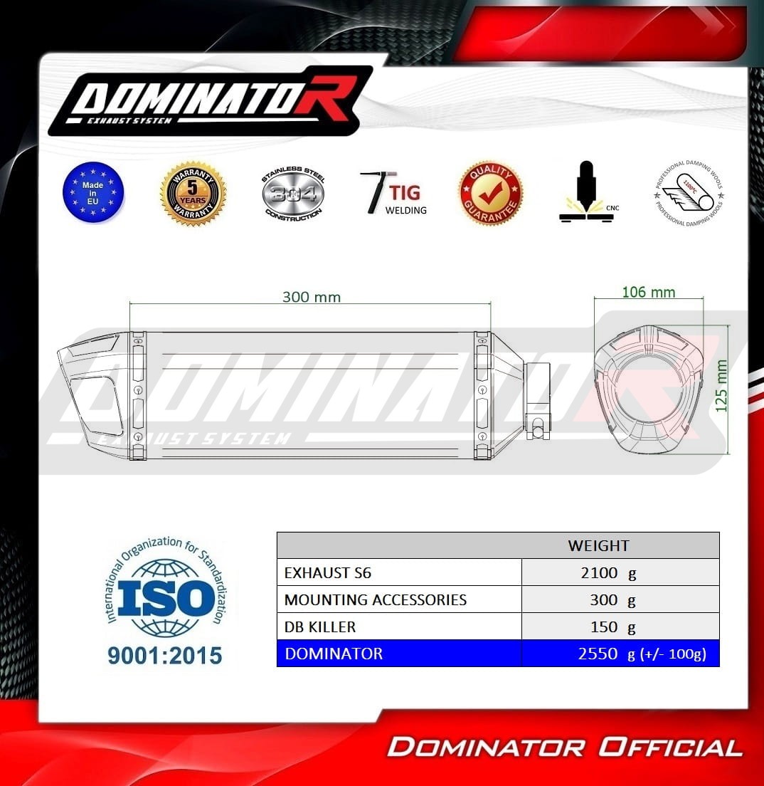 Der Dominator-Auspuff verleiht Ihrem Motorrad einen einzigartigen Klang und verändert dessen Charakter. Das Auspuffsystem erhöht die Motorleistung und das Drehmoment, während das Gewicht des Schalldämpfers reduziert wird.