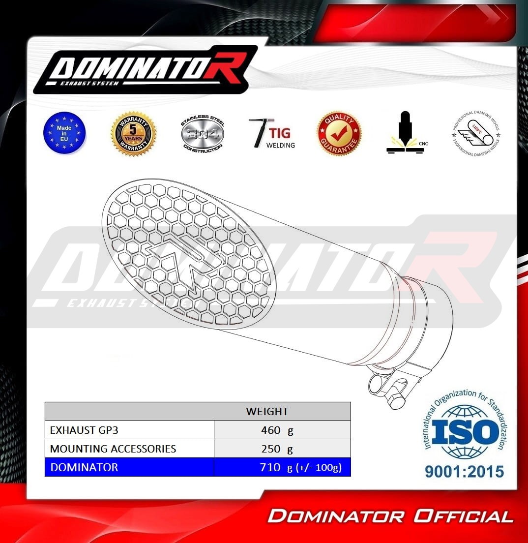 Das Dominator Auspuffsystem wird die Natur Ihres Motorrads verändern und ihm einen einzigartigen Klang verleihen. Das Auspuffsystem wird die Leistung und das Drehmoment des Motors steigern, während es das Gewicht des Schalldämpfers reduziert.